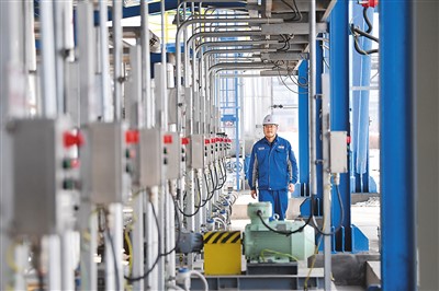 近年来,中国石油兰州石化公司加大科技创新力度,大力增产高附加值产品,自主研发的丁腈橡胶、炼油催化剂等产能已跻身世界前列,创新驱动和提质增效能力显著增强。图为该公司橡胶运行部丁腈二区域工艺技术负责人在进行生产装置日常巡检。